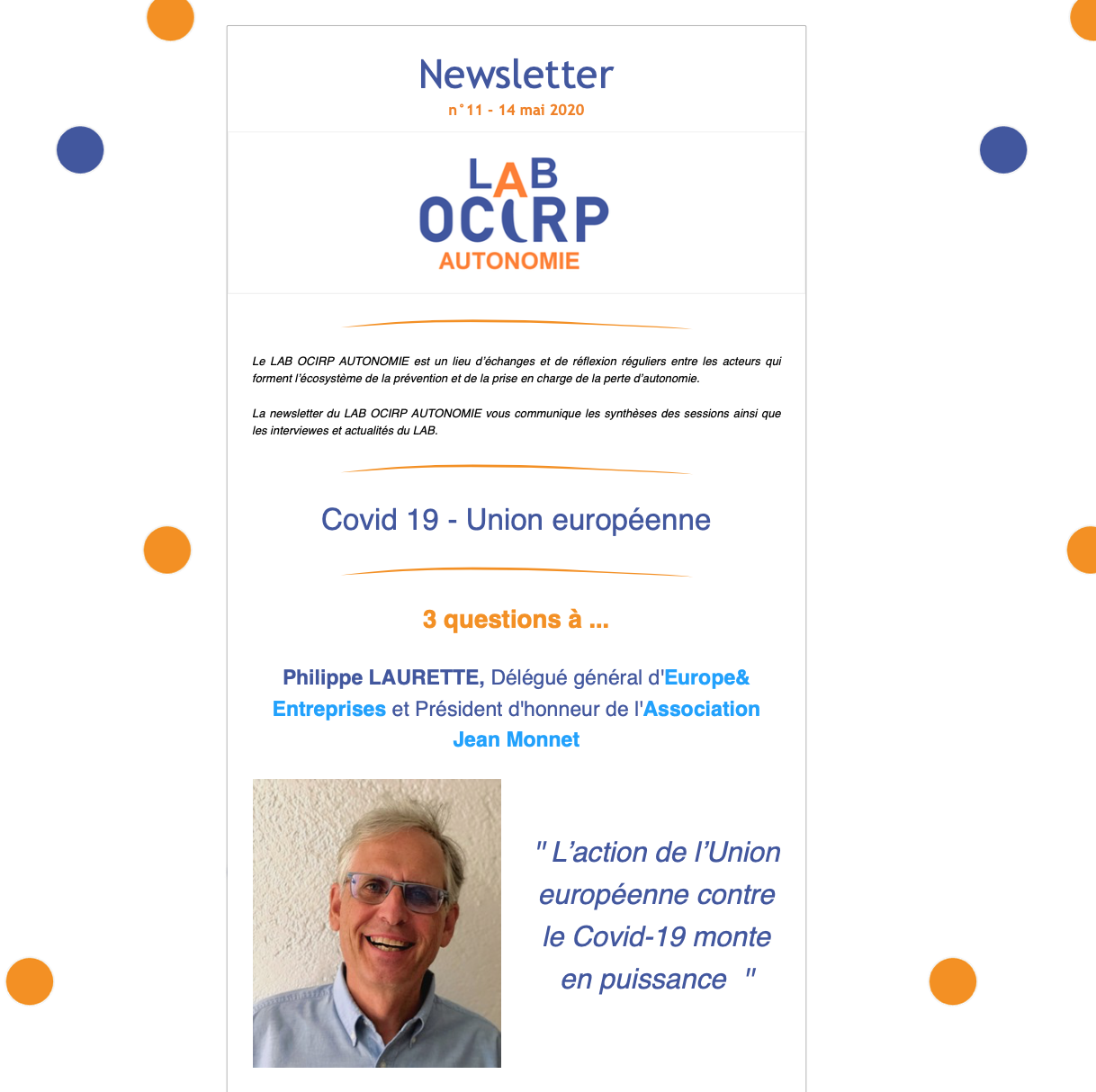 Trois questions posées à Philippe Laurette, au sujet de la gestion du Covid 19 par l'Union Européenne, dans la newsletter du 14 mai 2020 du LAB OCIRP AUTONOMIE.